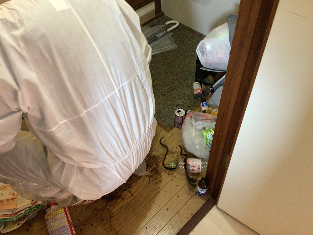 発見までに1週間以上かかったため体液が漏れ出し、家財などにも染み込んでいる状態